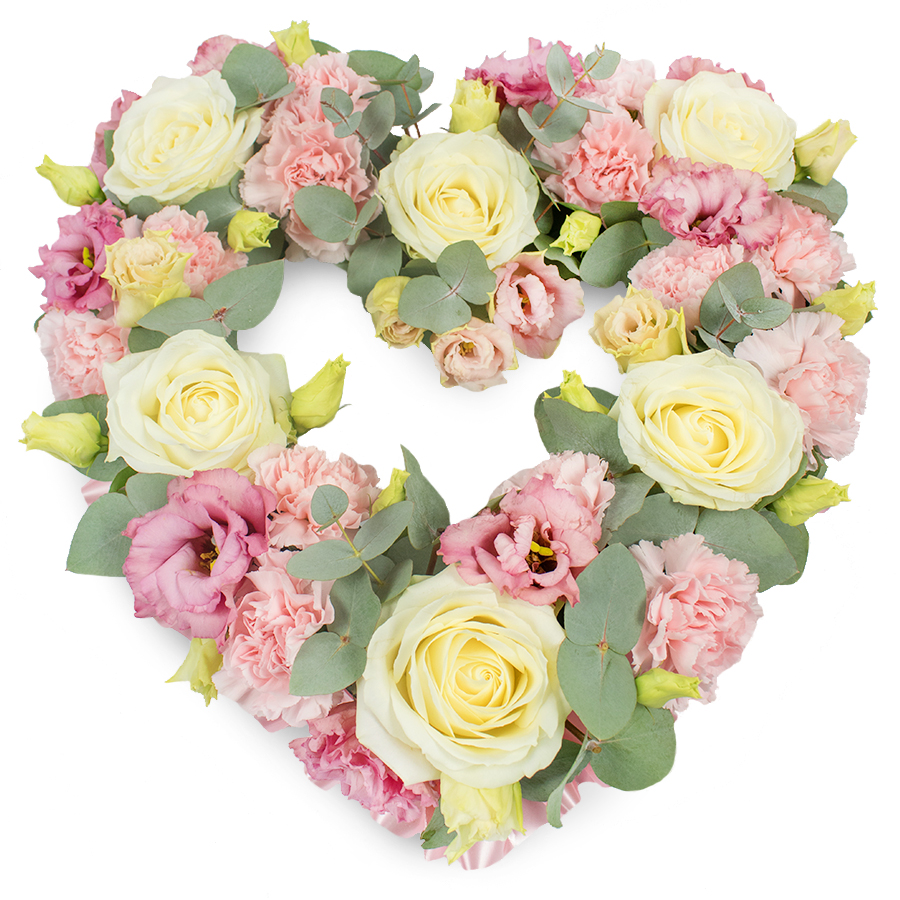 A full, symmetrical heart-shaped floral tribute is captured on a bright white background, its form lovingly built from layers of pastel blooms and soft greenery. Large cream and pale yellow roses are placed throughout the design as focal points, their velvety petals tightly coiled at the centre and expanding outwards, suggesting devotion and a carefully tended life. Interwoven with the roses are generous clusters of light pink carnations, each floret ruffled and frilly, creating a soft, almost cloud-like texture that fills the heart without a single gap. Deep pink and mauve lisianthus, also known as eustoma, are sprinkled through the arrangement, their looser, more open petals and subtle darker centres adding dimension, gentle contrast, and visual rhythm, like ripples of colour moving across the wreath. Silvery-green eucalyptus leaves curve naturally around and between the flowers, their rounded, slightly matte surfaces catching the light in cool, calming tones that frame the heart and give it structure. Small, tightly closed yellow-green buds appear in pockets around the design, introducing hints of new growth and quiet hope. The result is a dense, luxurious wreath that feels both tender and dignified, reminiscent of the peaceful atmosphere along the riverbanks in Marlow or the stillness of a churchyard in the late afternoon. This heart-shaped arrangement would serve beautifully as a funeral tribute, memorial wreath, or sympathy piece in Marlow, a visual expression of remembrance, gratitude, and enduring affection that offers gentle comfort to family and friends gathering to say goodbye.