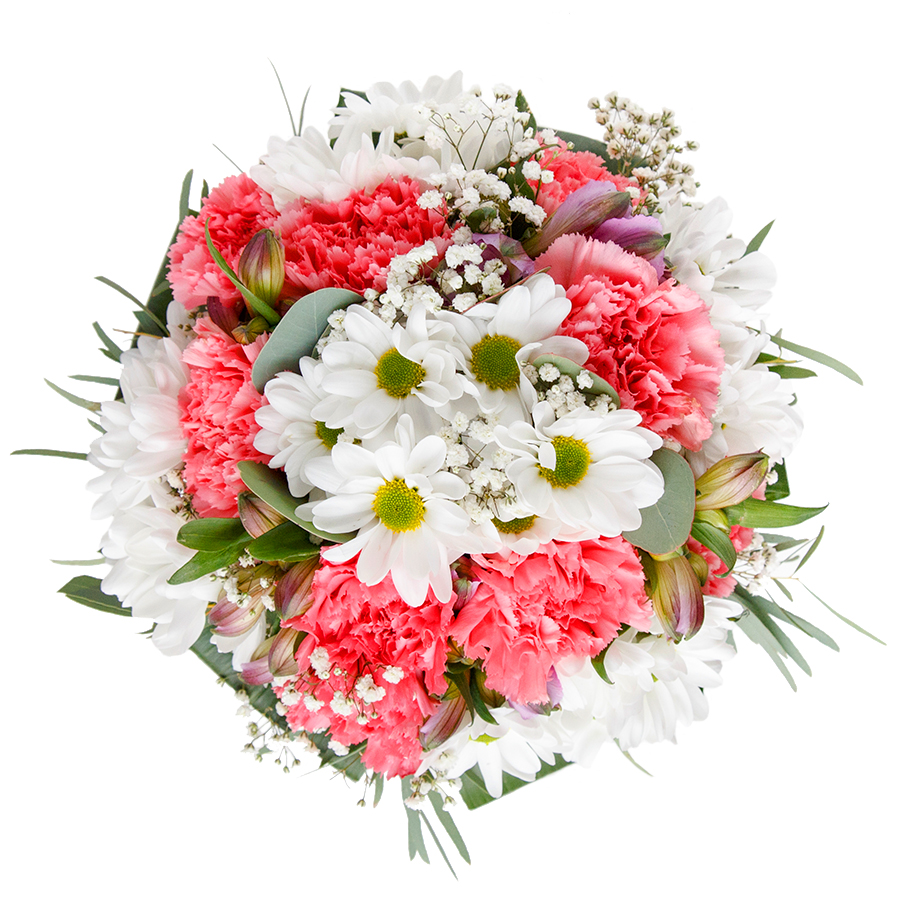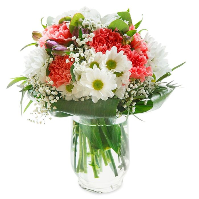 Indulge in the elegance of our luxurious seasonal flower arrangement. This unique bouquet combines snow-white chrysanthemums, delicate gypsophila, and charming light pink carnations, all meticulously arranged with aspidistra leaves for a sophisticated touch.